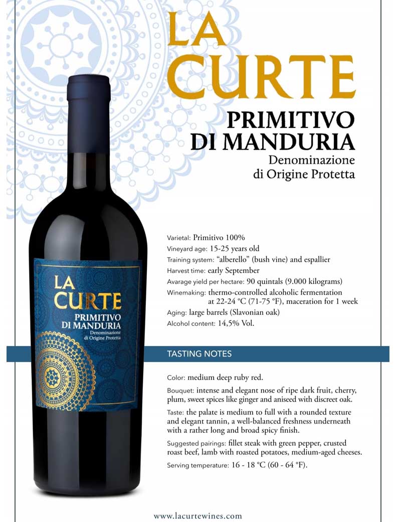 La Curte Primitivo di Manduria là loại rượu vang đầu tiên được tạo ra ở Manduria được tạo ra bởi giống nho nổi tiếng Primitivo. Trải qua mỗi niên vụ, hương vị rượu có một sự tươi mới nhất định. Tuy nhiên nhìn chung, vang Ý La Curte Primitivo di Manduria vẫn giữ được phong cách thanh lịch ban đầu của mình qua năm tháng.